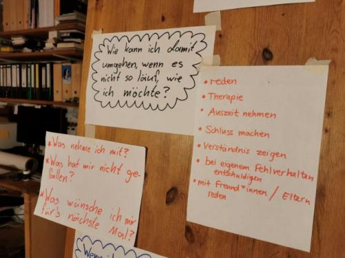 z.B. B wie Beziehungen. Eine Traumreise bildet den Einstieg in das Thema, es geht um freundschaftliche und romantische Beziehungen. Was ist in Beziehungen wichtig? Woran merke ich, dass es nicht so läuft wie ich es möchte? In Gesprächen wird versucht diesen und anderen Fragen auf den Grund zu gehen. Nicht fehlen dürfen beim Thema Beziehungen K wie Konsens und G wie Grenzen.